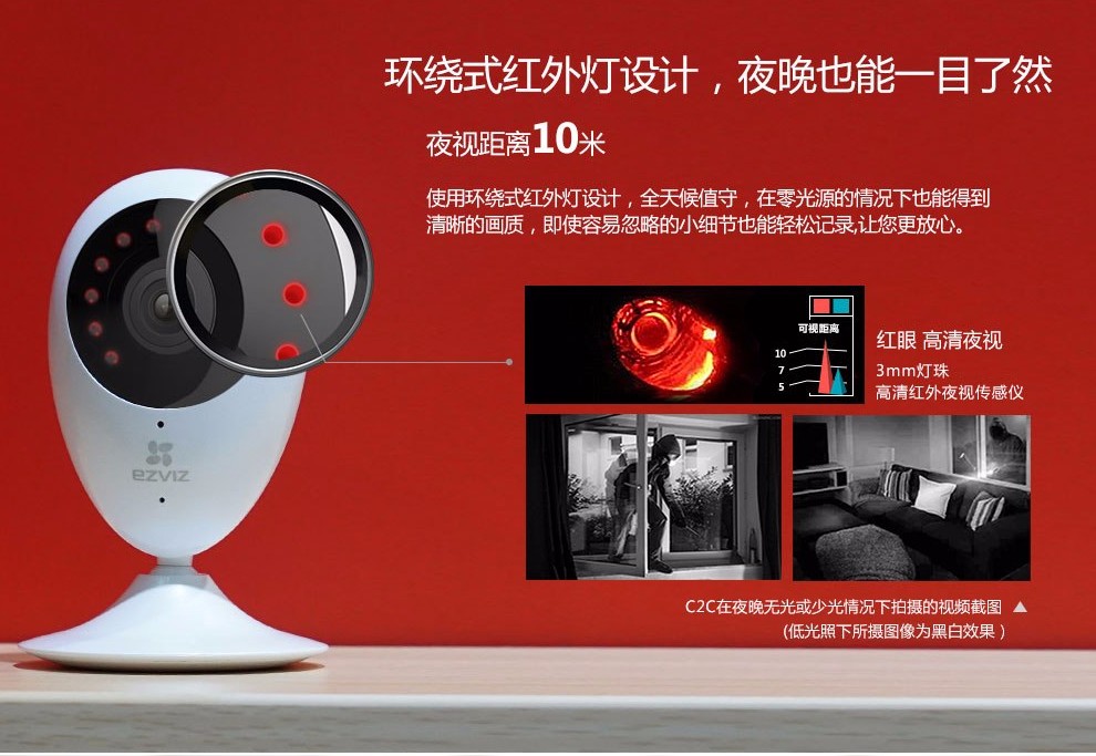 海康-螢石高清家用網(wǎng)絡(luò)攝像機(jī),200萬(wàn)像素,1080P高清分辨率,畫(huà)質(zhì)清晰,成像效果一流;高清廣角視角,輕松覆蓋每個(gè)角落,;紅外高清夜視效果翻蓋范圍達(dá)10米,再也不用擔(dān)心夜晚看不清的尷尬。
