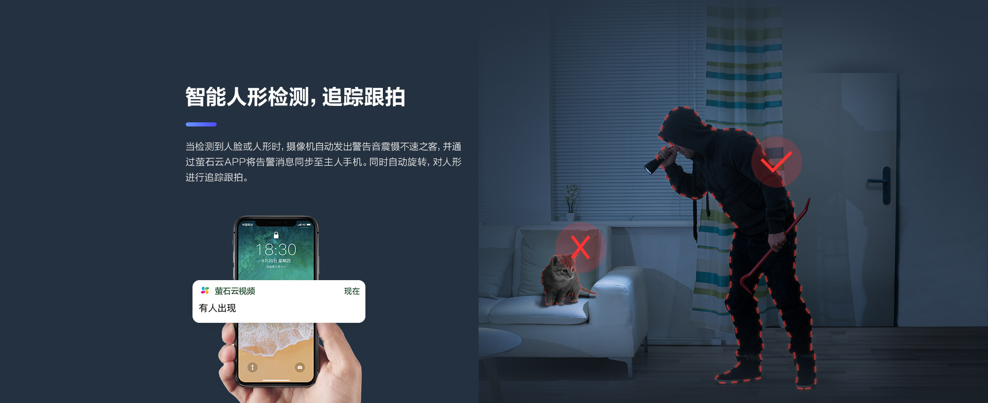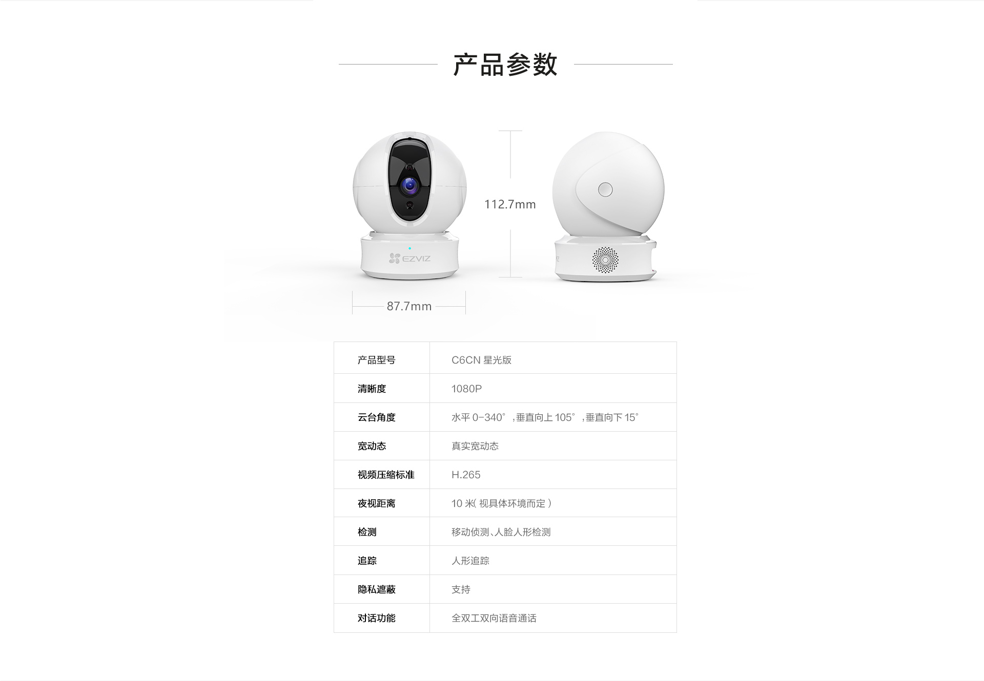 海康螢石C6CN星光級紅外夜視網(wǎng)絡攝像頭,可360度全方位監(jiān)控、雙LED紅外燈10米夜視距離、人臉人形偵測追蹤、一鍵鏡頭遮蔽隱私保護。