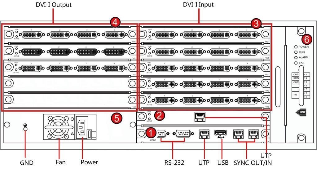 2/3.輸入業(yè)務(wù)板插槽 | 6 個(gè)輸入板槽位,支持 VGA、DVI、HDMI、BNC、YPbPr、HDBaseT、DP 及 IP 源多種信號(hào)解碼 |